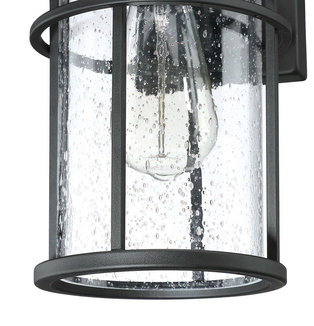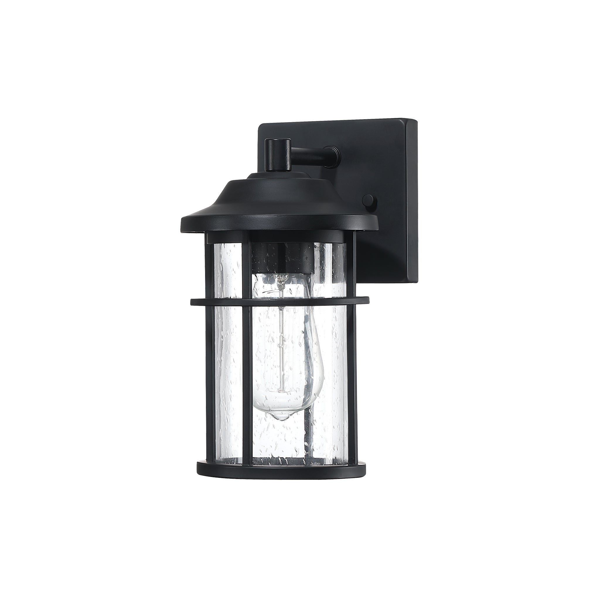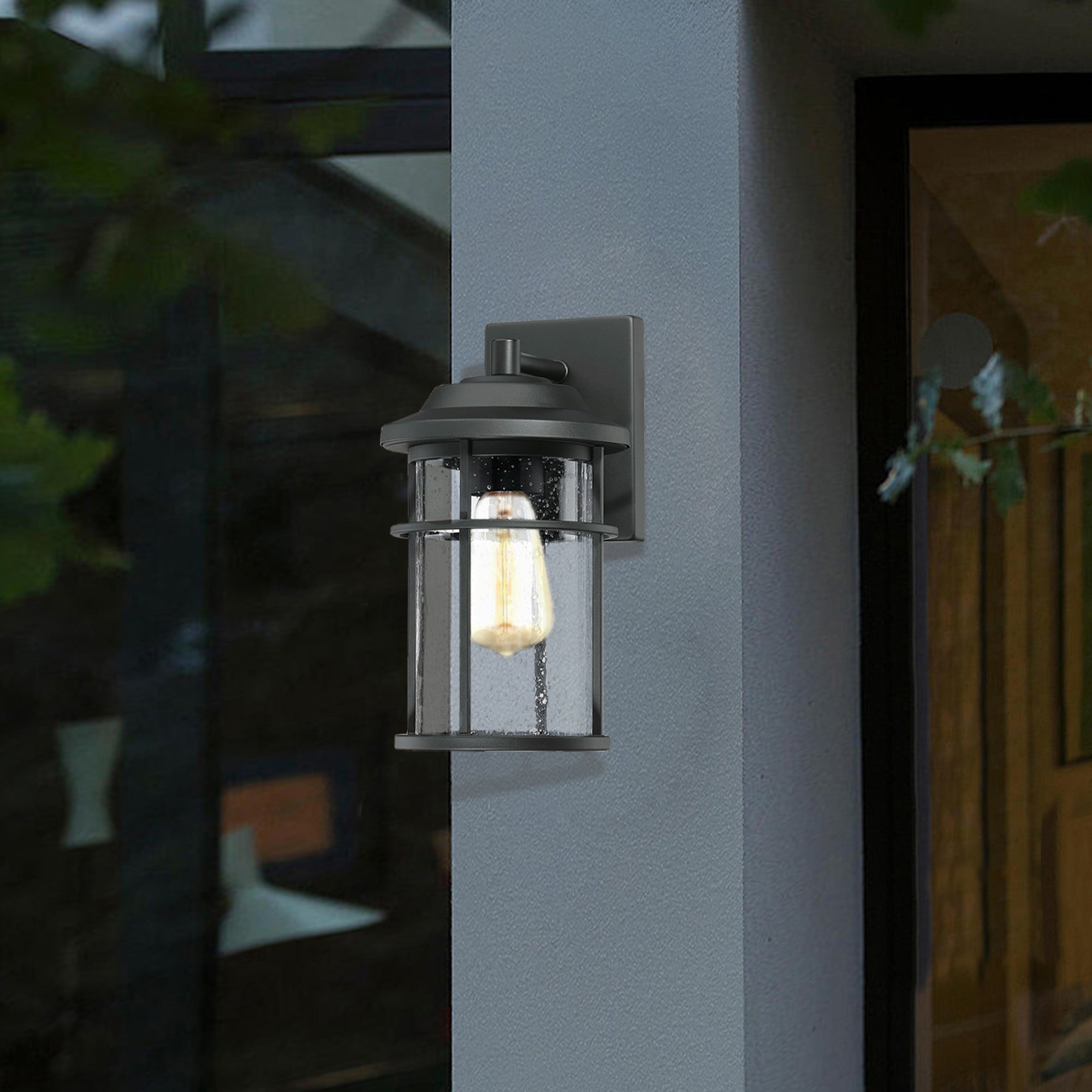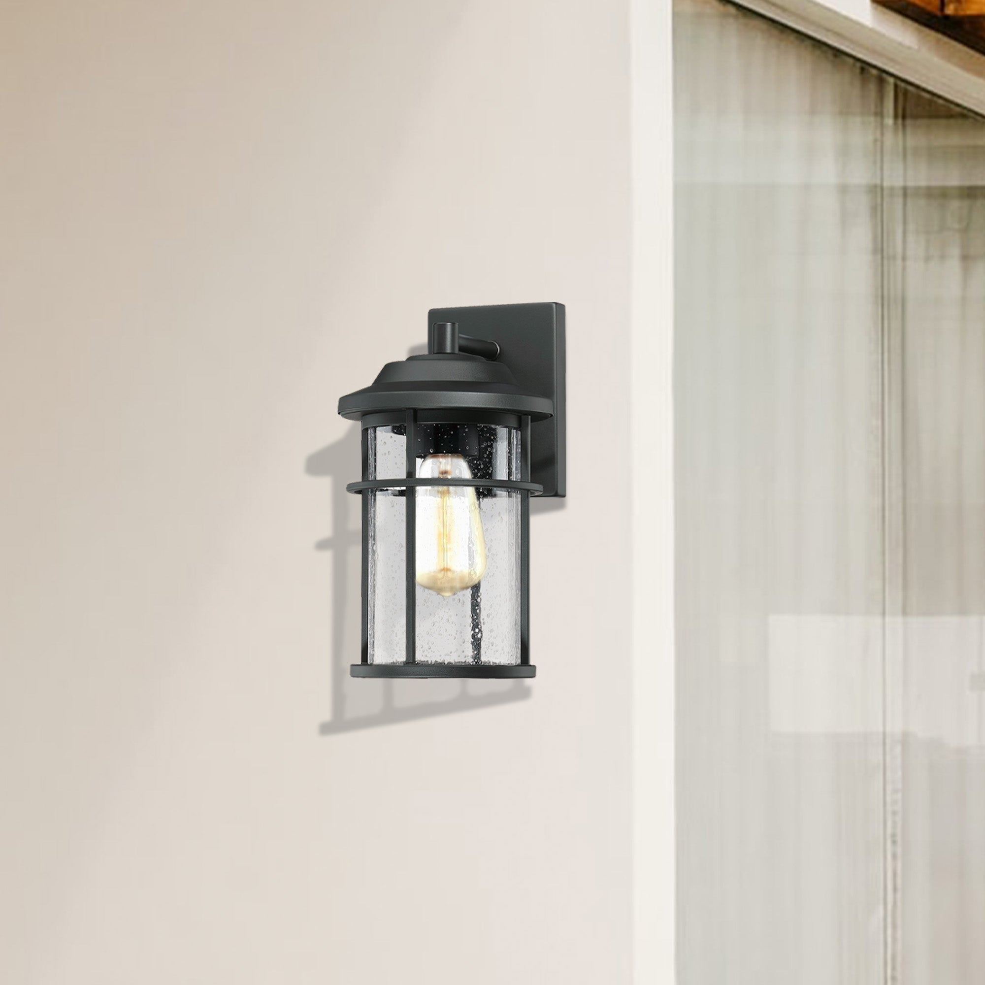This lantern with a clean contemporary design with a black finish to accent all décor styles. The clear seeded glass allows the maximum light that creates an additional design element.: With its classic black finish and clear seeded glass panes, the minimalistic design of this wall lantern complements any décor making it the ideal piece for all your outdoor lighting needs. This product is perfect for indoor and outdoor spaces including doorways, porches, and entryways.