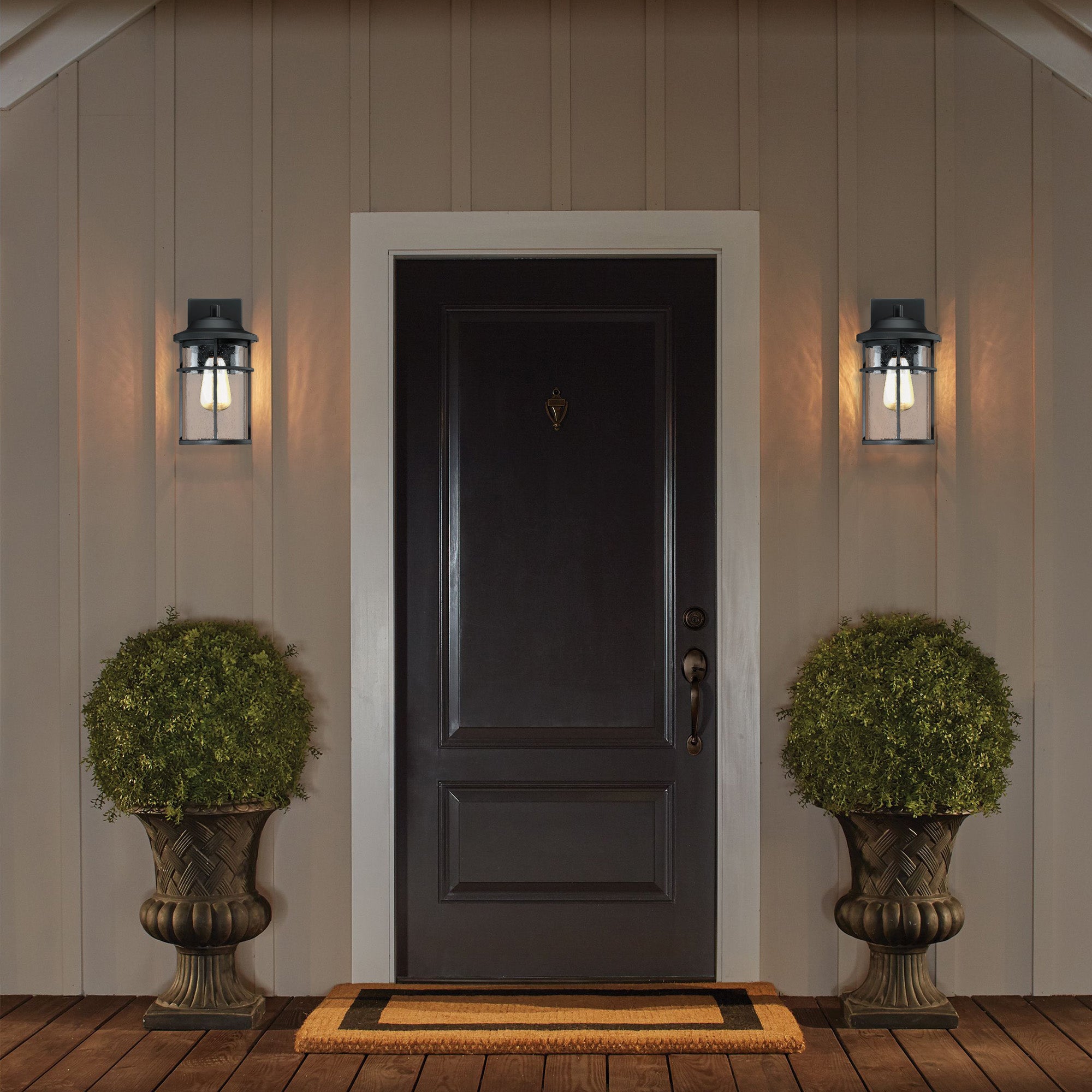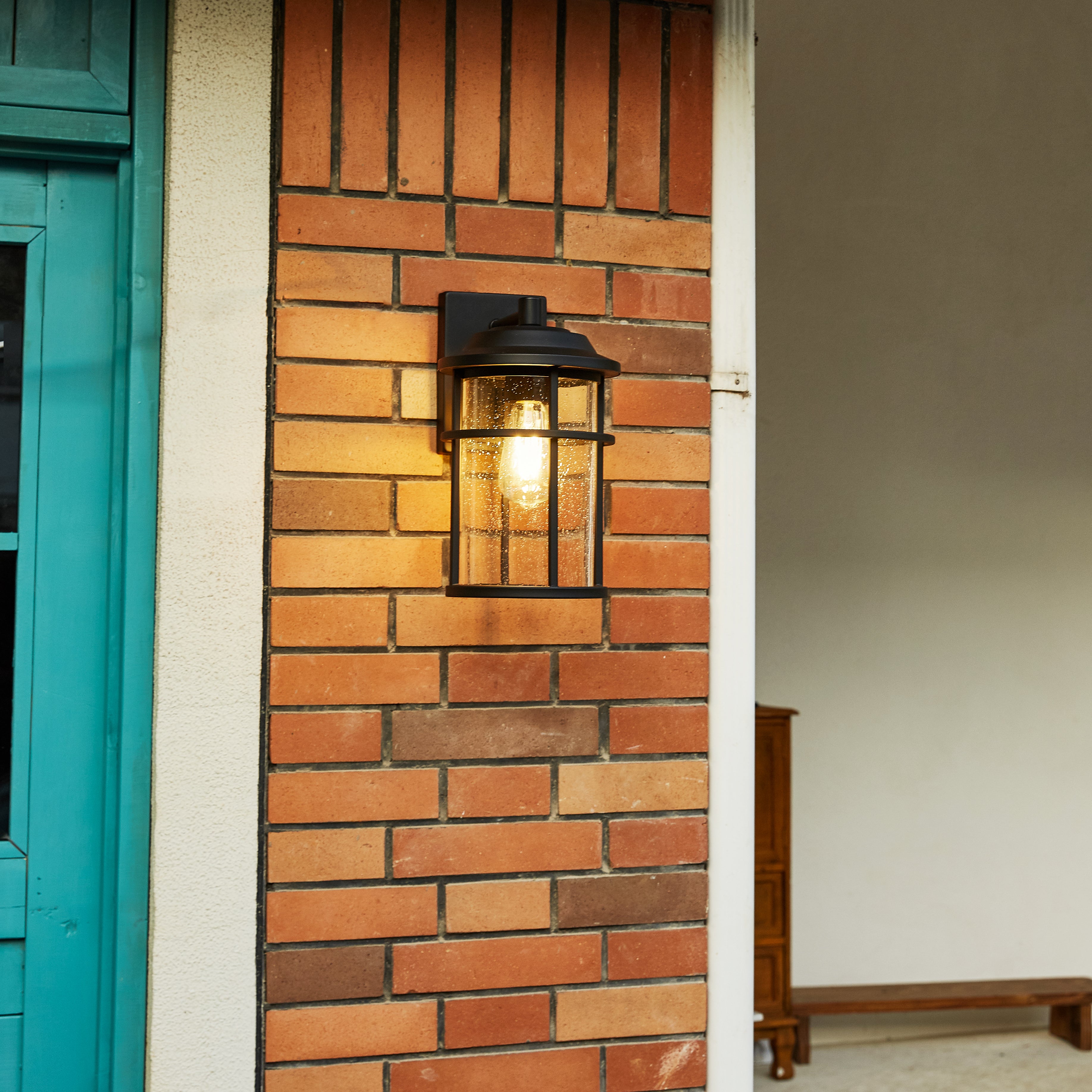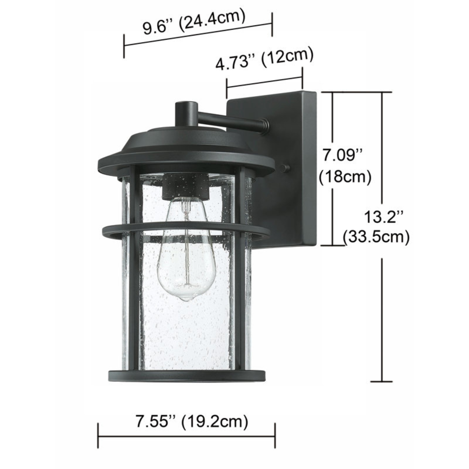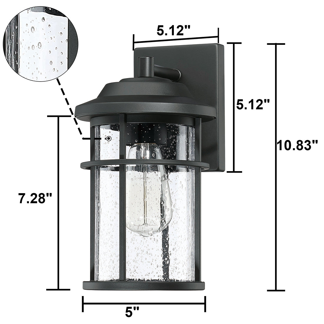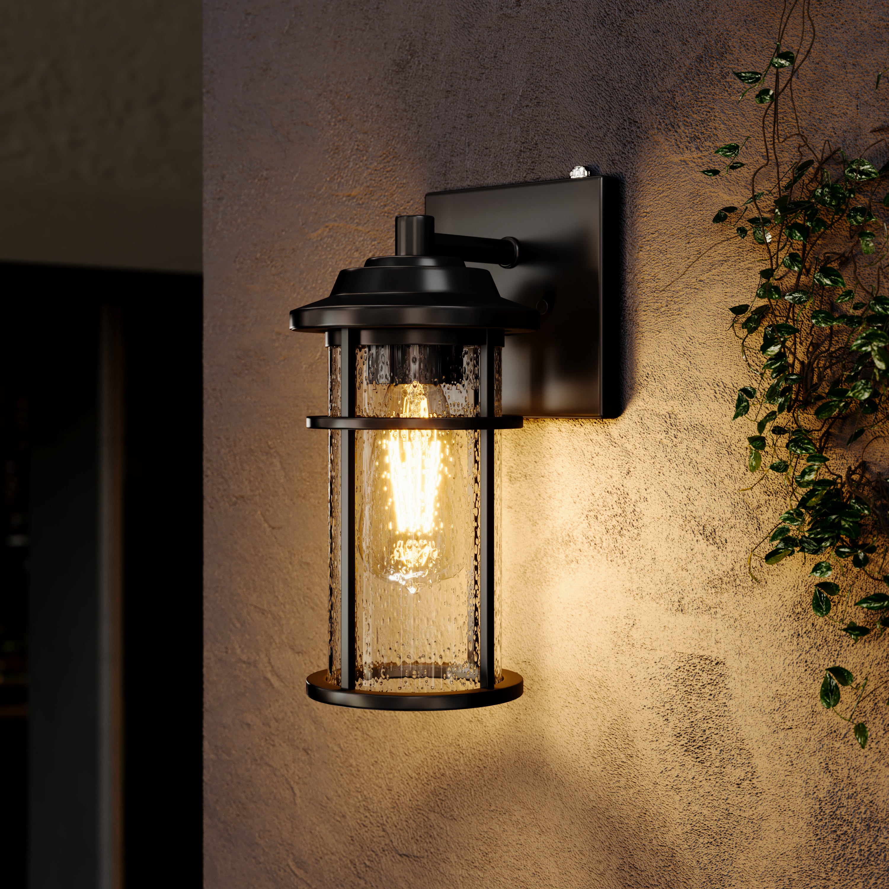 This lantern with a clean contemporary design with a black finish to accent all décor styles. The clear seeded glass allows the maximum light that creates an additional design element.: With its classic black finish and clear seeded glass panes, the minimalistic design of this wall lantern complements any décor making it the ideal piece for all your outdoor lighting needs. This product is perfect for indoor and outdoor spaces including doorways, porches, and entryways.