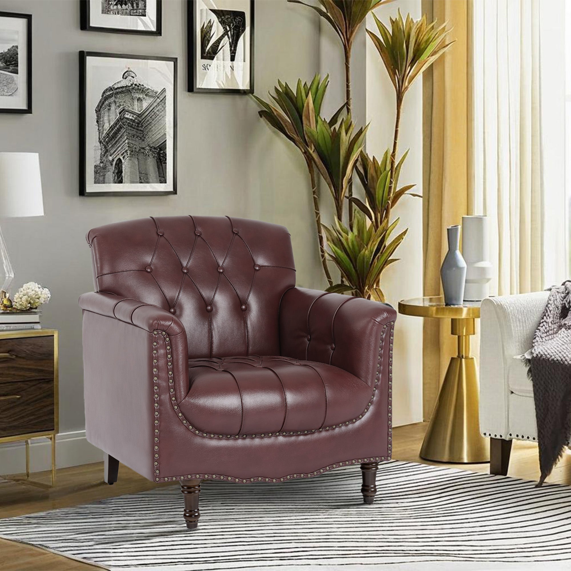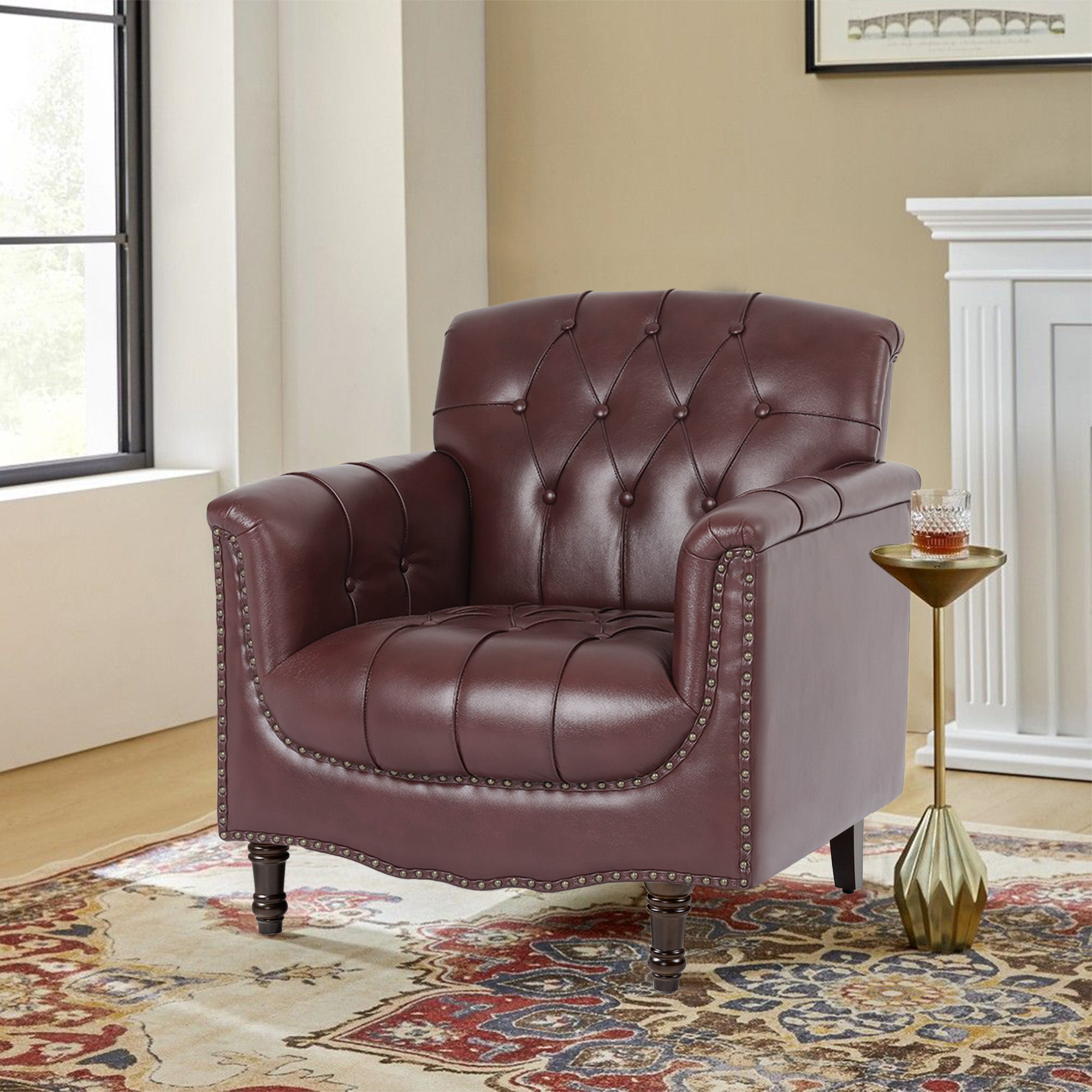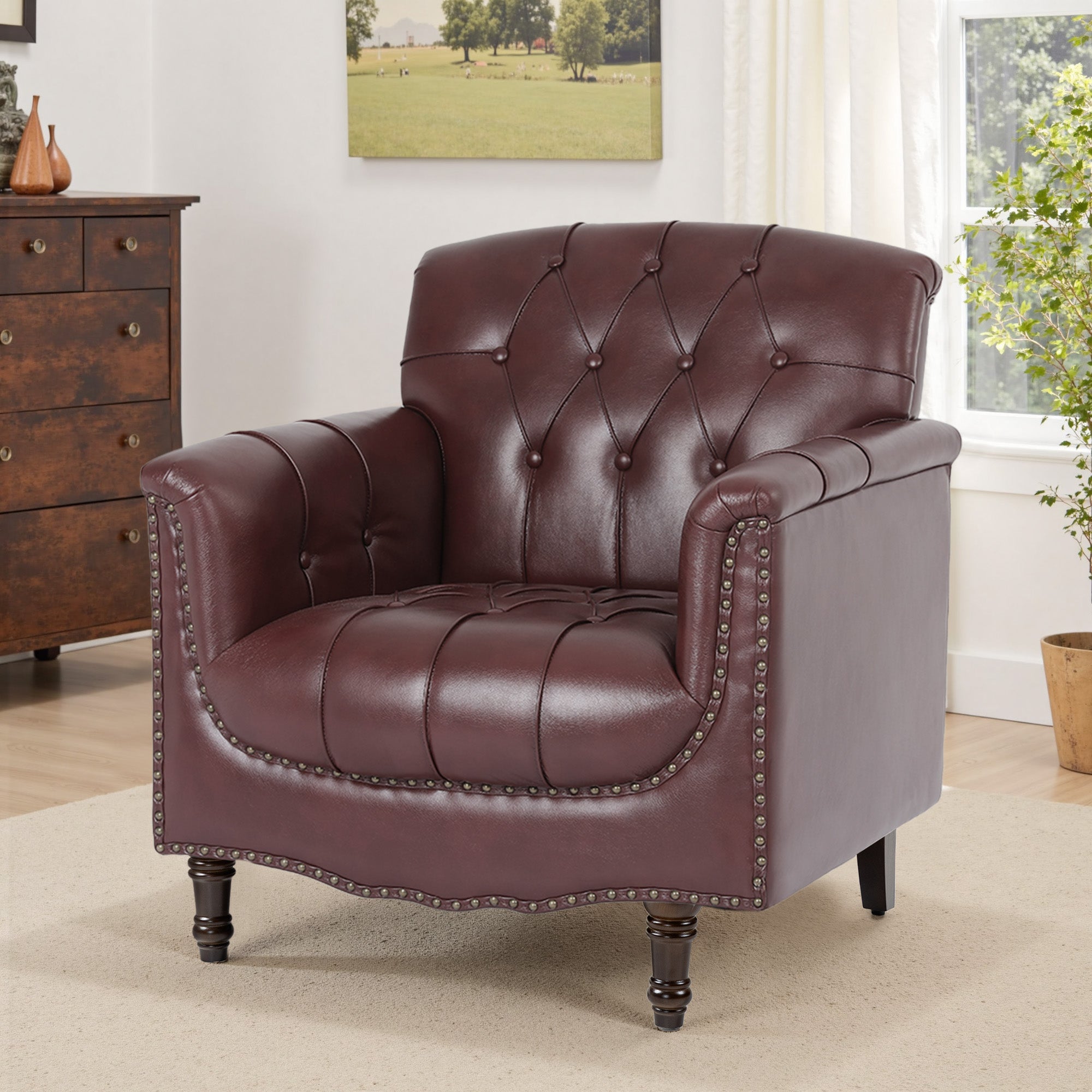 Sink into comfort with this tufted faux leather chair, designed to bring style and cozy relaxation to any space. The soft high-density foam seat and deep button-tufted back provide plush support, while the rolled arms and sturdy wood frame ensure durability for everyday use. Ideal for reading, enjoying a quiet coffee, or hosting friends, it creates a welcoming and elegant corner in your living room, office, or study.